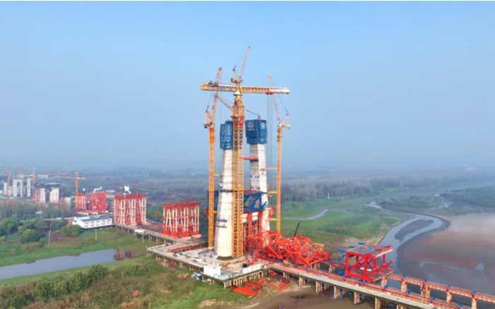 常泰长江大桥主航道桥主跨1176m,主塔总高352m,采用XGT15000-600S塔机进行上部钢塔柱施工吊装仅需将钢塔柱划分为30个吊装单元 金牌影视资源,最大单元重量超500t,较传统施工方式效率提升60%以上, 。