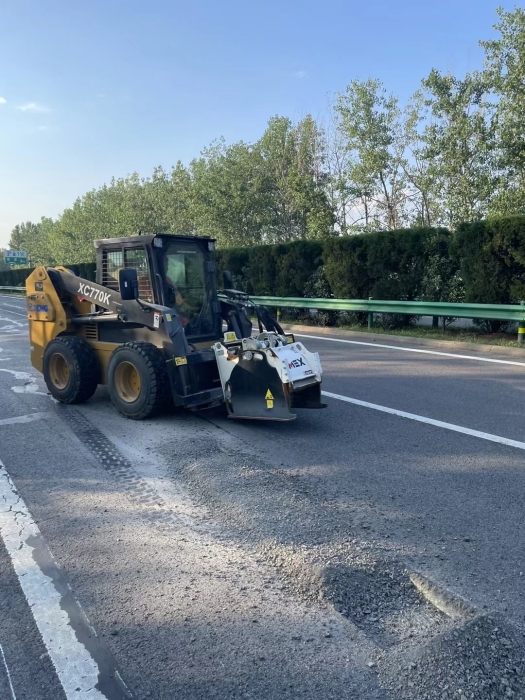 徐工滑移装载机搭配铣刨器高速公路坑槽病害快速铣刨,预留台阶 金牌影视资源,便于分层压实和提升路基结构稳定。