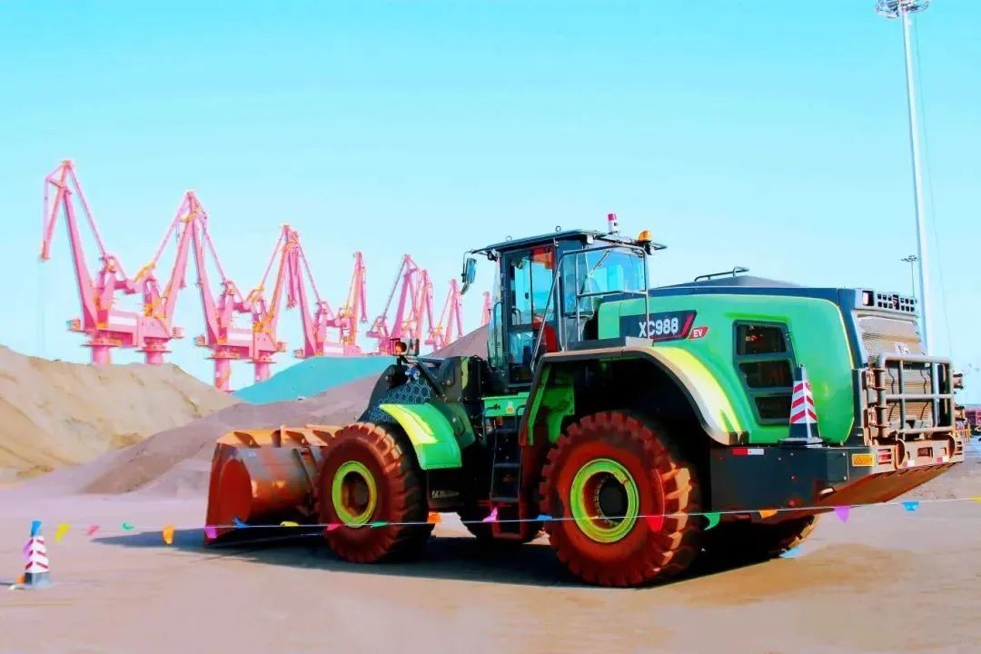 此次使用的纯电动装载机型号为徐工XC988-EV,额定载重8500kg,额定功率590kW,最大掘起力240kN 金牌影院免费观看,大铰接,大开档,矿山级车架结构件设计,采用CAE仿真分析,机器人焊接等智能设计制造手段,满足各种超重载工况作业要求,与港口散货作业需求十分贴合。