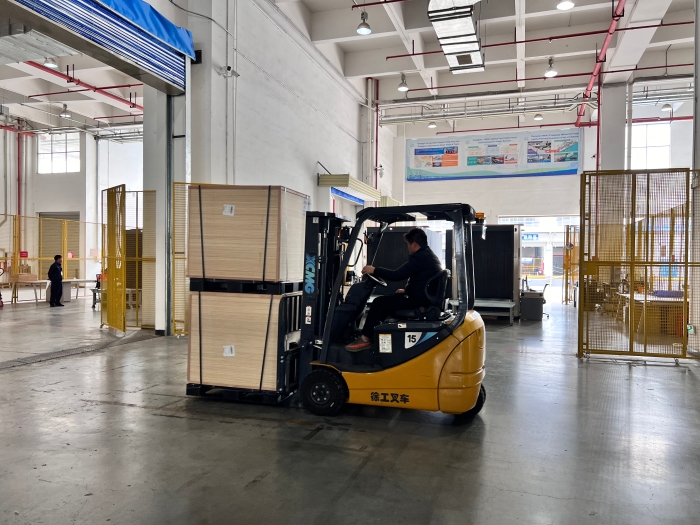 在华南区某大型保税仓内,十几台徐工三支点系列叉车正在进行紧张的搬运工作 金牌影院.
