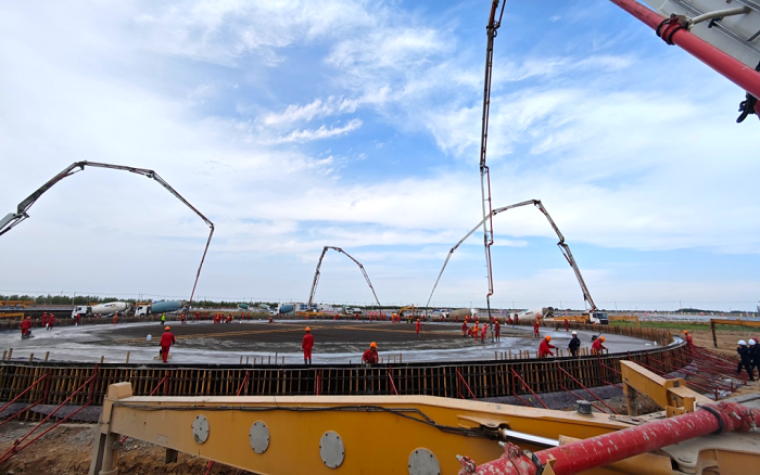 据了解,该项目库容量200万立方米,新建20座10万立方米外浮顶储罐,占地约650亩,项目建设面临泵送方量大 金牌影院在线观看,持续时间长,浇筑无间断等特殊施工要求,徐工大米数泵车凭借稳定高效,节能可靠,智能安全,成为项目泵送主力军。