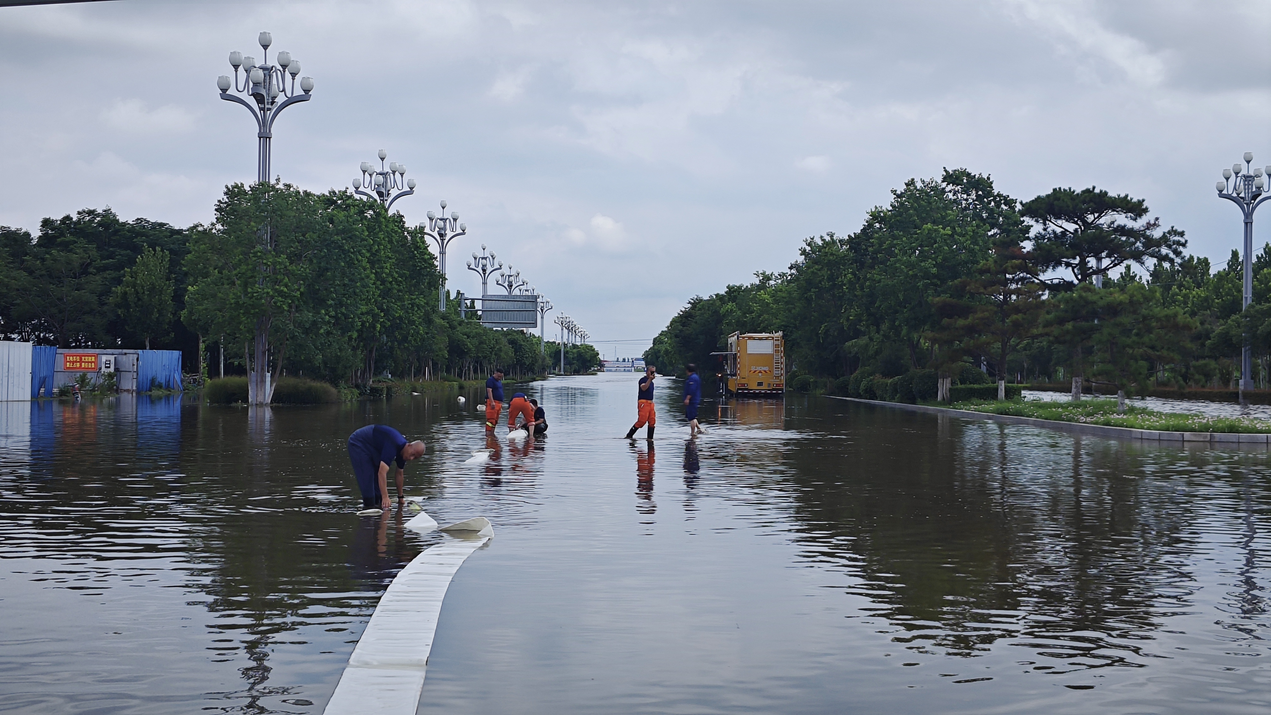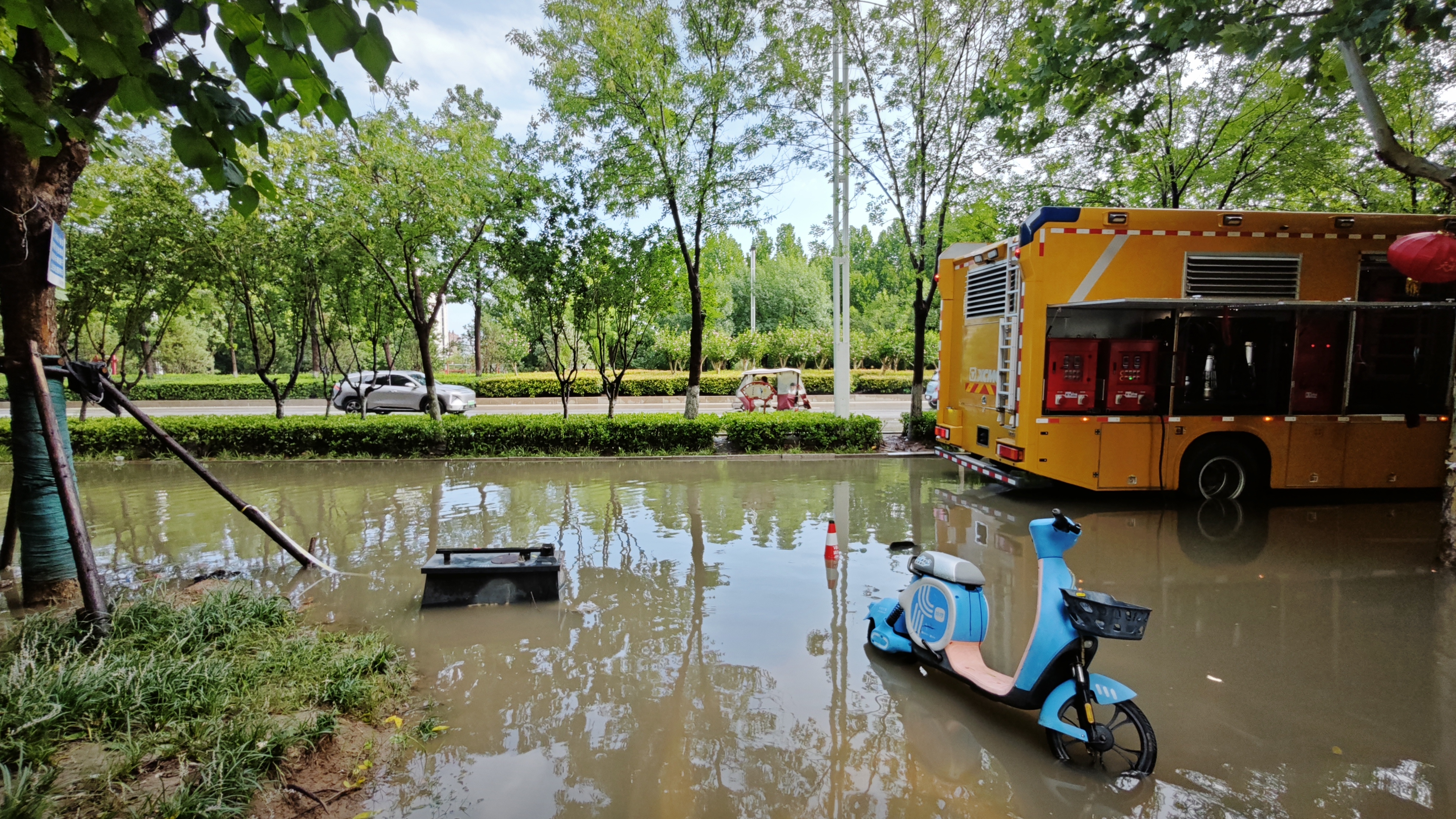华商大道同属商丘市睢阳区,此处靠近河堤,周边道路积水均向此处转移 金牌高清播放,交通主干道被积水淹没,影响城市正常通行。