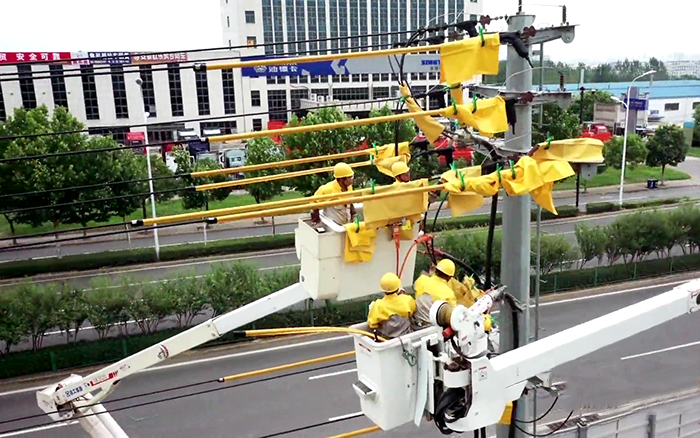在电力杆线迁改施工现场,4名带电作业人员严格做好安全措施后,穿上黄色的绝缘服,乘坐徐工GKJH21绝缘斗臂车升入高空 金牌高清播放,将跨滁河大桥上的原10千伏泗水04线上电缆与架空线连接引线断开,为当日连接新建线路做准备,整个施工过程高效,安全,平稳,获得现场施工负责人的认可。