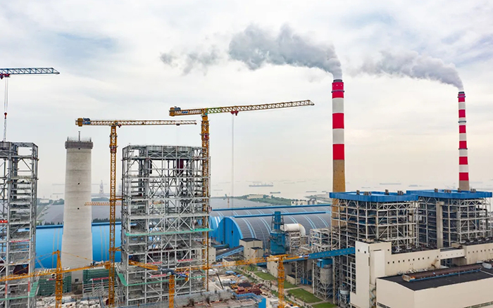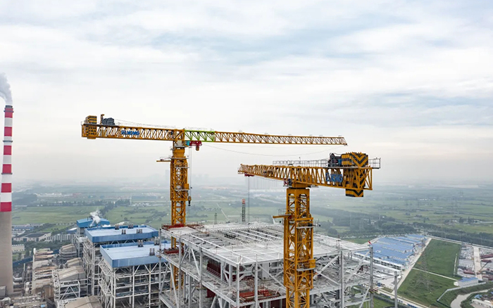 侧望长江畔 金牌影院,机器轰鸣,江水潺潺,华能太仓电厂机组扩建项目施工现场一派繁忙景象,XGT3100-160S,XGT1350-64S两台徐工超大塔稳稳矗立在高耸的钢架间吊装作业。