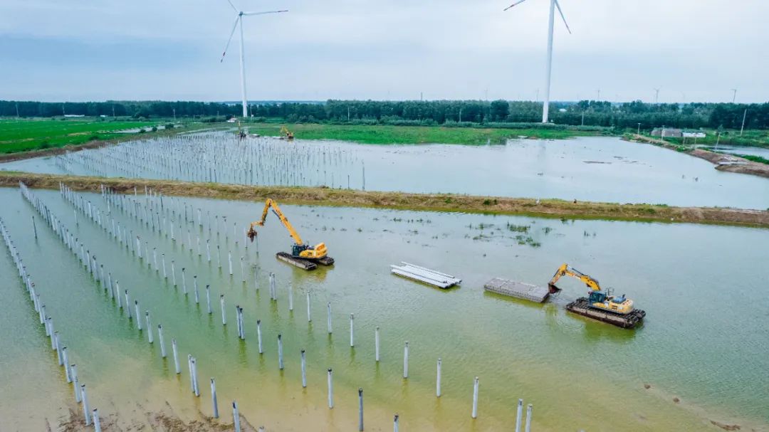 在渔业较为发达的滨海港镇,“渔光互补”光伏发电项目建设正如火如荼,项目现场 金牌影院在线观看,徐工水上打桩机的身影随处可见。