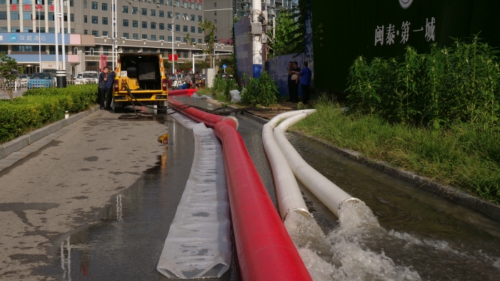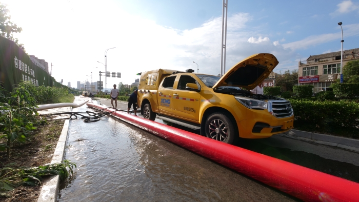 调试车辆 金牌影视资源,铺设水带,检查管路,现场排水作业紧锣密鼓地进行着,XGH5030TPSQ6争分夺秒与时间赛跑,每台车流量超600m³/h,最大可达1000m³/h,将积水源源不断地排入下水道中。