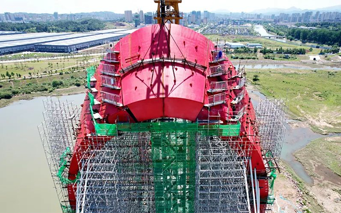 随着重达40吨的主桥钢塔柱最后一个节段