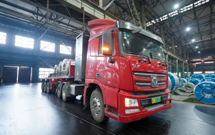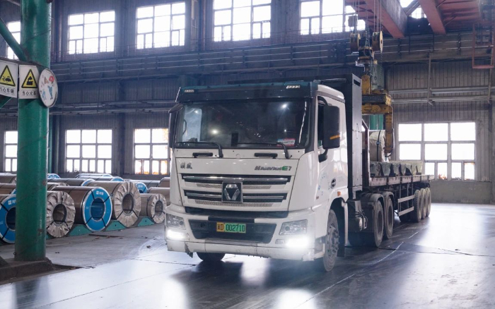 在河北某钢厂仓库出货场地,几卷巨大的钢材正被行车稳稳吊起 金牌影院,缓缓落在一辆等待装载的徐工新能源重卡载货平板上,多台徐工新能源重卡安静地排列在场地一侧,等待依次出发。