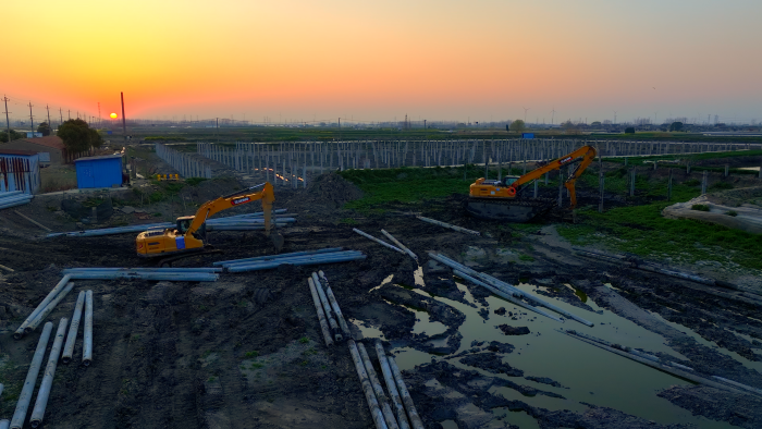 徐工XE270GK改装水上打桩机,依托精准的操控和强劲的动力,将一根根10多米长的混凝土预制桩准确无误地压入指定的位置,为后续支架,组件 金牌影院在线观看,发电板安装等关键环节的有序推进“保驾护航”。