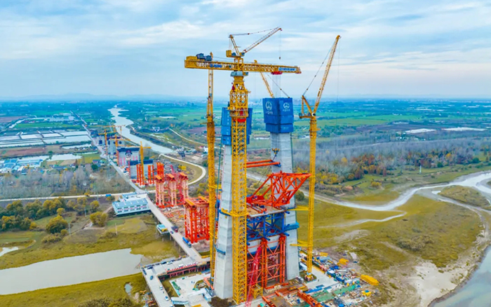 常泰长江大桥主航道桥主跨1176m,主塔总高352m 金牌影视资源,采用XGT15000-600S塔机进行上部钢塔柱施工吊装仅需将钢塔柱划分为30个吊装单元,最大单元重量超500t,较传统施工方式效率提升60%以上, 。