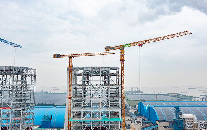 侧望长江畔,机器轰鸣 金牌影院,江水潺潺,华能太仓电厂机组扩建项目施工现场一派繁忙景象,XGT3100-160S,XGT1350-64S两台徐工超大塔稳稳矗立在高耸的钢架间吊装作业。