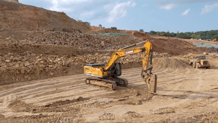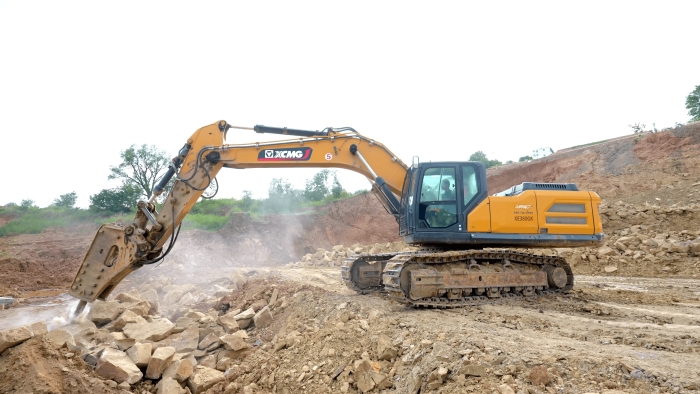 站前区堆积的大体积岩体 金牌影视资源,正被徐工XE380GK的破碎锤系统转化为可再生建材。