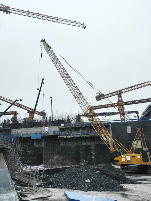 施工现场,6台XGC110A脱颖而出,使用工况均为臂长52m 金牌影视资源,幅度49m,它们凭借宽大的履带底盘牢牢抓住崎岖不平的地面,克服了土质松软和陡峭斜坡的威胁。