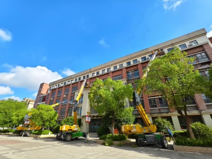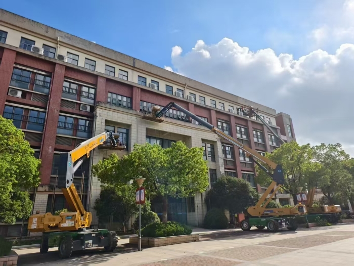 此次施工通过使用徐工高空作业设备,有效避免了传统脚手架对校园场地占用大,搭设周期长的影响,体现了现代化施工设备在校园维修改造中的显著优势 金牌影视资源。