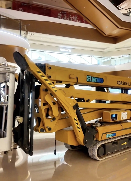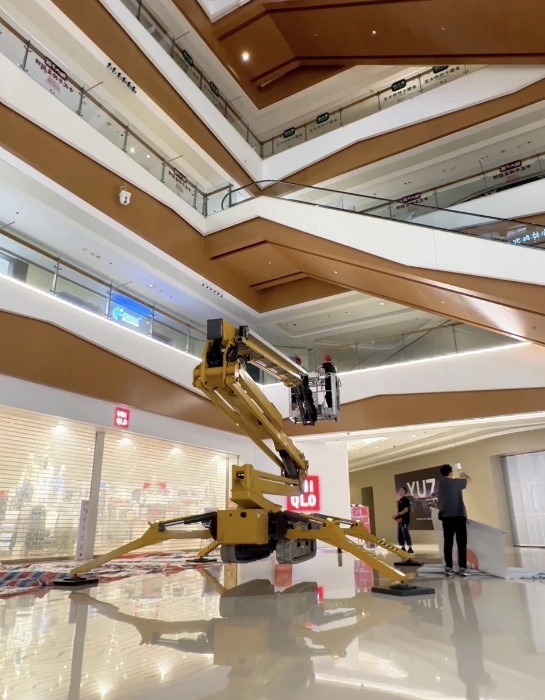 在杭州某大型商场,徐工XGS26X-Li将四只“蜘蛛腿”稳稳“扎根”在商场中庭,正在向玻璃围栏下方的墙壁伸展臂架,超窄车身“溜”进商场,伸缩臂架“瞄”准墙面 金牌影院,这是徐工蜘蛛车在商场进行维修保养的日常,而看似日常的施工,需要面对三关“难题”。