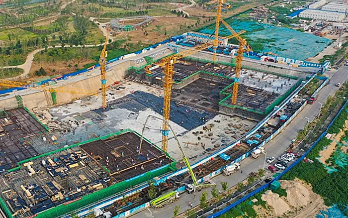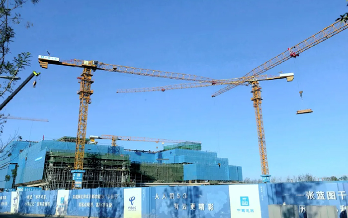这片建筑群是雄安新区中国电信智慧城市产业园项目 金牌影院, 徐工S系列塔机奋战在施工一线,见证雄安崛起。