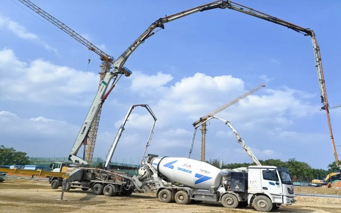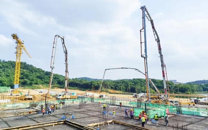 此次浇筑项目为长江军事主题文化区-中山舰博物馆关键部分,徐工以 “1+2+10+1” 成套化设备迎战:1台HB72V,2 台HB62V大米数泵车打头阵 金牌影院,10台12方新能源搅拌车,1台XGT7026-12S1塔机组成 “补给梯队”,展现“1+2+10+1 > 14”的成套化作业优势。