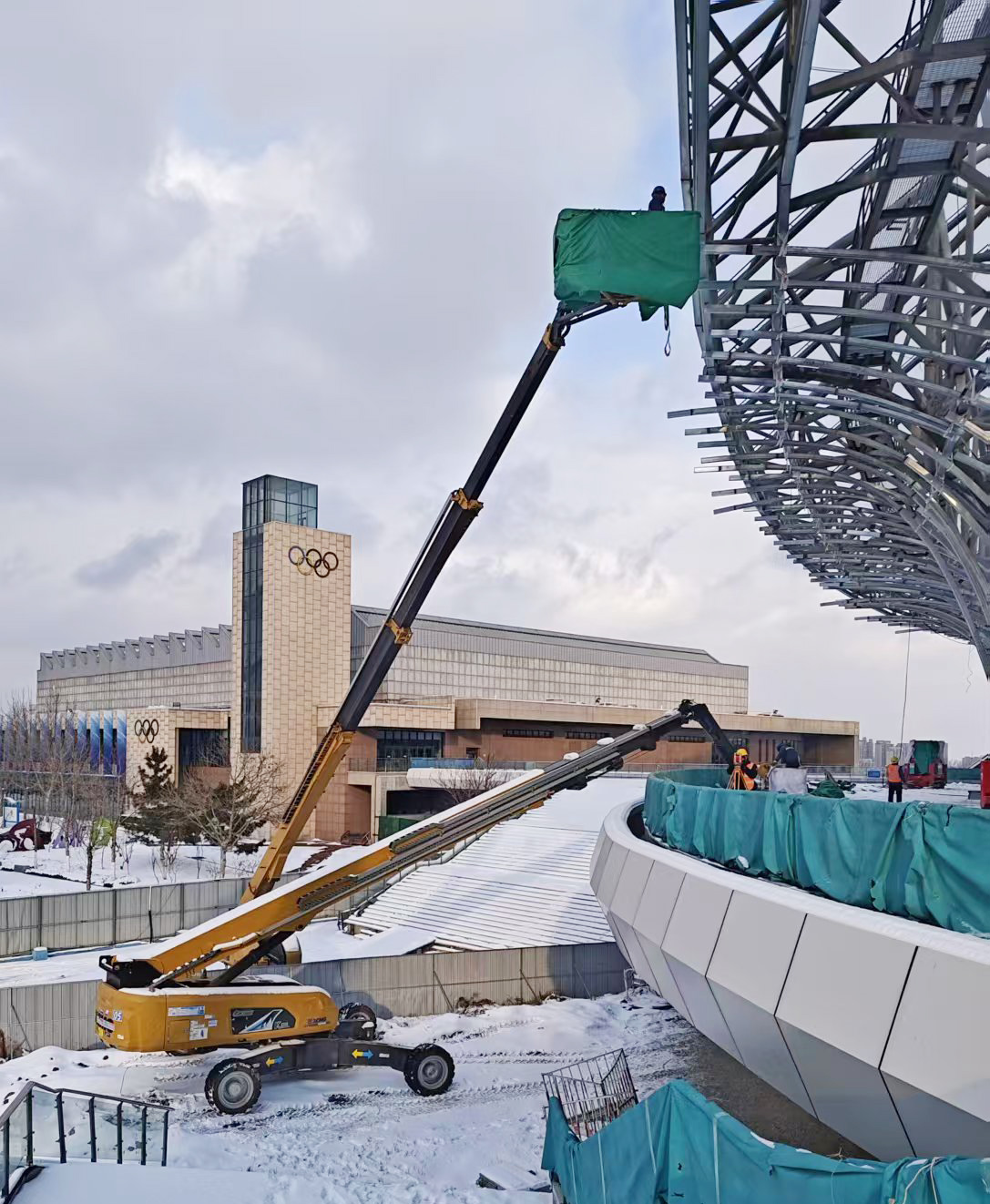 近日 金牌影院,全国多地气温骤降,城市迎来普遍降雪,位于山东烟台的蓬莱体育馆建设项目正面临冬季雪天施工的严苛考验,为保障施工进度,XGS30K,XGS40K,XGS45K,XGS58K等16台徐工高米数柴动直臂高空作业平台,组成“高空攻坚队”顶雪作业。