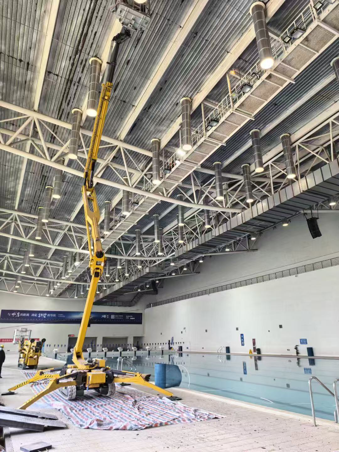 近日,3台徐工XGA26X-Li蜘蛛曲臂高空作业平台在徐州奥体游泳馆有序展开施工,该项目主要涉及屋顶瓦片更换 金牌影院,除锈翻新等作业,施工面积约3200㎡,计划工期为一个月。
