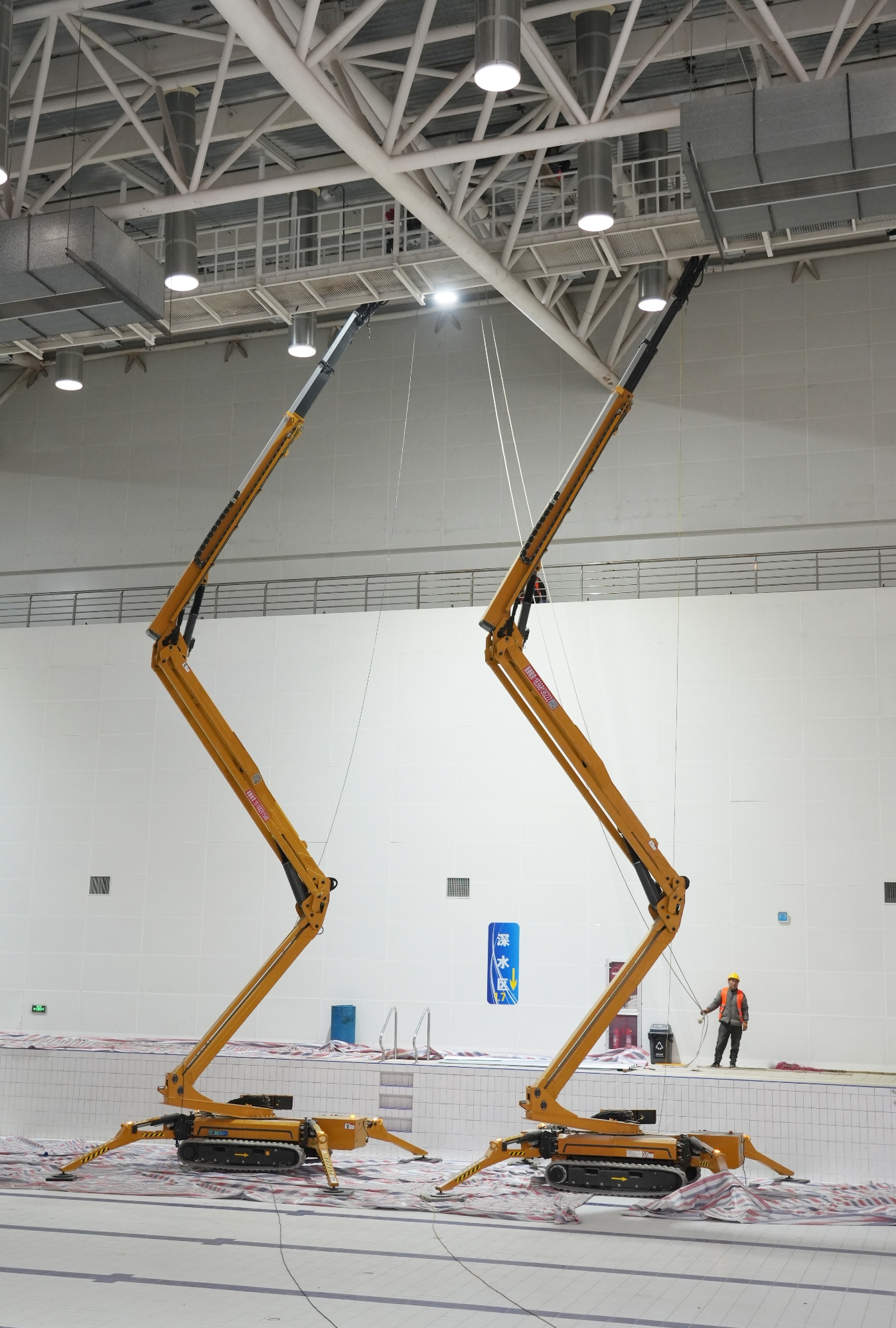 据悉 金牌影院在线观看,该项目策划伊始,便遇到两大难题:场地狭窄,入口宽1m高20m,且场馆下方为地下车库,地面承重低,普通臂车无法进场,若采用传统脚手架,需满架搭建,成本高且工期长,面对如此工况,徐工XGA26X-Li蜘蛛车精准破局,成为受限空间施工核心利器。
